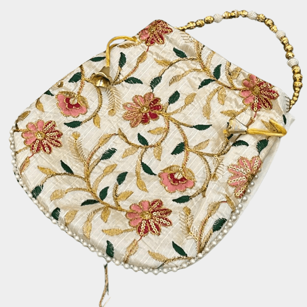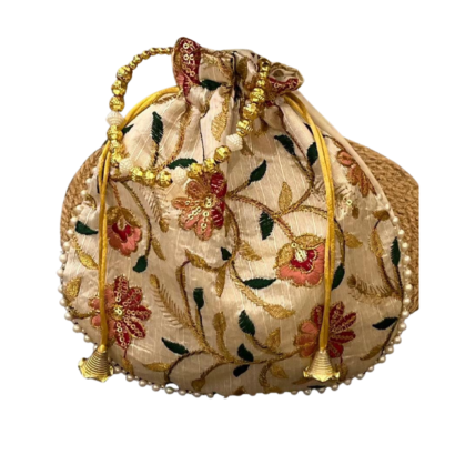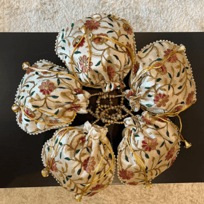 This Off White Fancy Potli With Enough Space For Mobile, Wallet And Keys. Ideal For Return Gift To Ladies. Dimensions – 8.5’ X 8.0’ These Potlis Have Enough Space For Wallet, Mobile And Keychain.. Can Be Given As Return Favours For Ladies… Can Be Ordered Individually Or Set Of Five…
